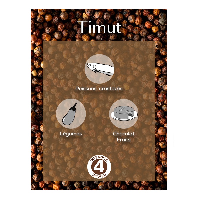 Timut Poivre sauvage du Népal, 40g - 4 sachets fraicheur de 10g Provenant du Népal, cette baie sauvage pousse à plus de 2000 mètres d’altitude. Peu piquante, elle surprend par ses saveurs acidulées et ses notes d’agrumes étonnantes.