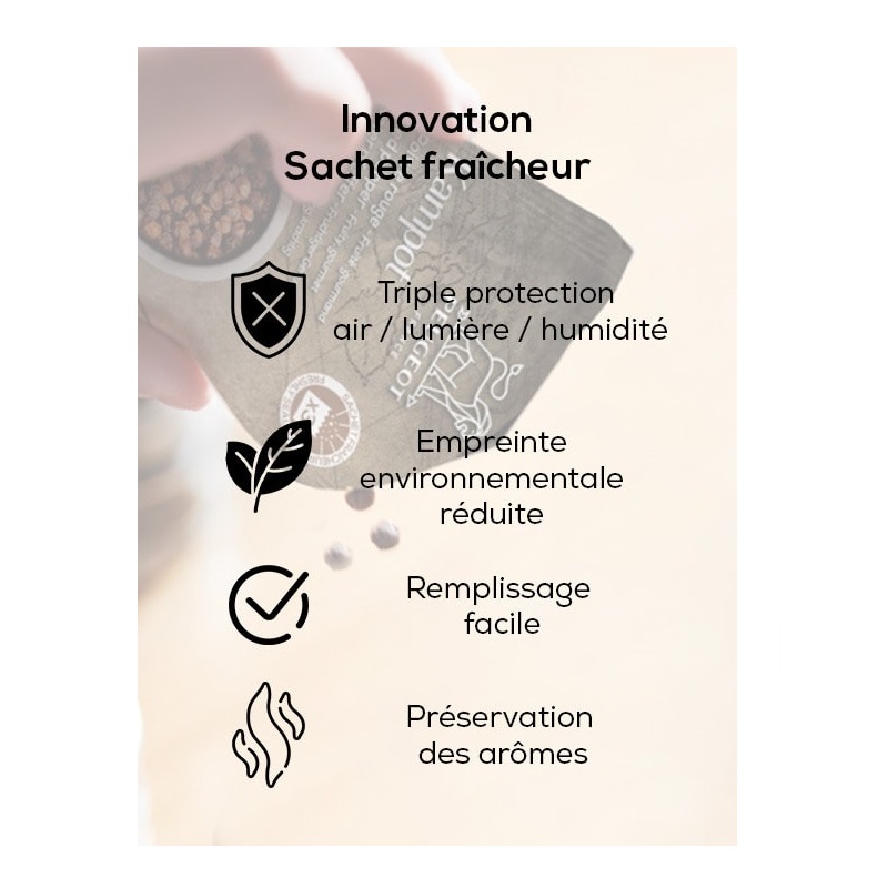 Proposé en sachets hermétiques pour une conservation optimale - Remplissage facilité - Triple protection : air / lumière / humidité - Empreinte environnementale réduite - Préservation des arômes