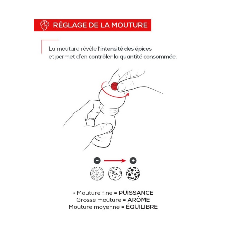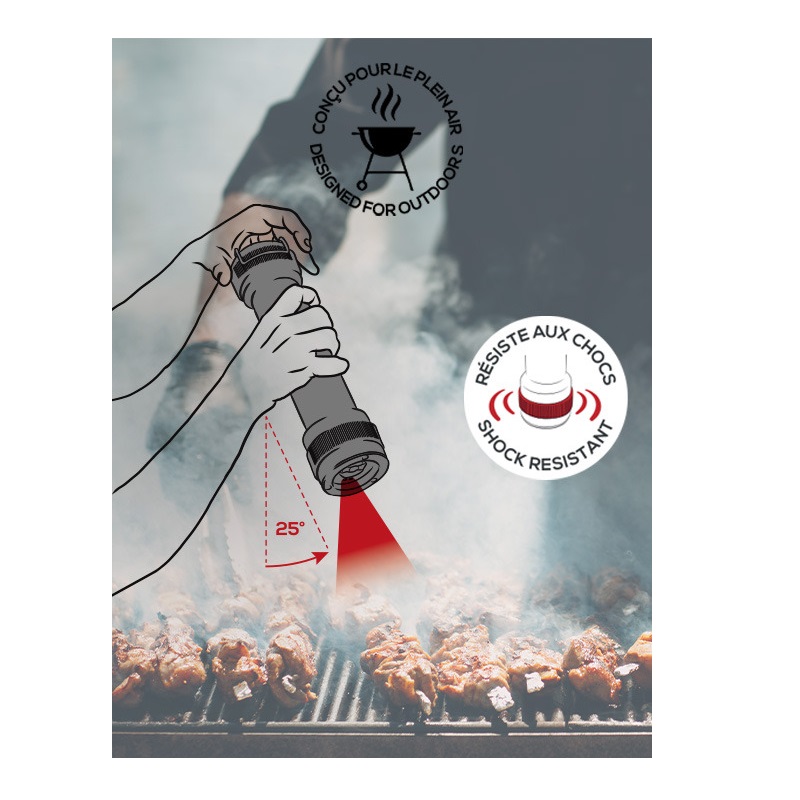 - Moulin spécial barbecue - Fabrication française - Pensé pour un usage Outdoor - 1er moulin manuel avec éclairage - Déclenchement de la lumière par inclinaison de 25° du moulin, extinction progressive en position verticale - Autonomie longue durée de la lumière (LED) - Poignée pour transport facile - Résiste aux chocs - Bois PEFC, issu de forêts Françaises, teinte et vernis hydrosoluble - Réglage de mouture u’Select : 6 tailles de moutures prédéfinies - Mécanisme garanti sans limitation de durée - Moulin garanti 5 ans - Pour moudre poivres noirs, blancs, verts ou rouges, baies roses (15% maxi dans un mélange de poivre) et graines de coriandre